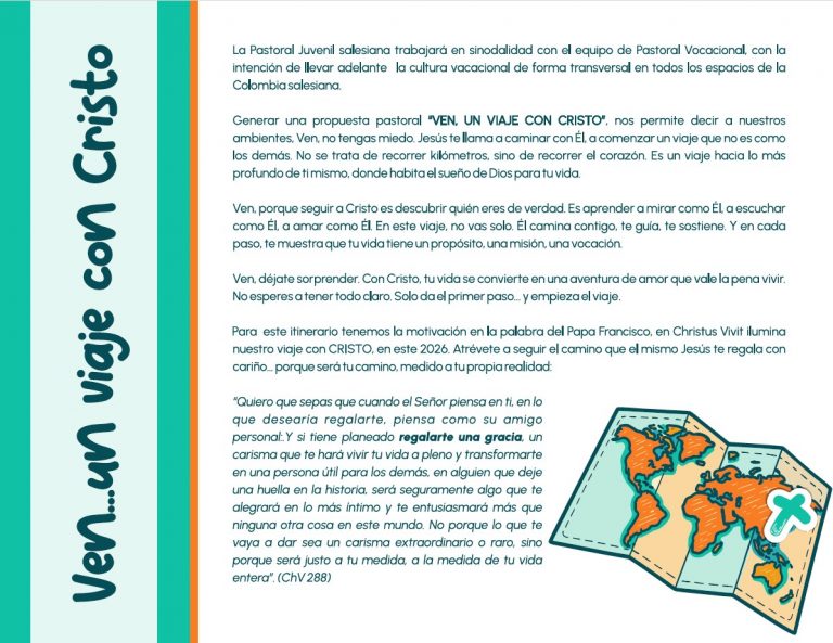 “Ven, descubre, vive: un viaje con Cristo” es el lema que guía los tres años de la propuesta pastoral, marcando un itinerario de encuentro, conocimiento y misión. Un camino formativo que invita a acercarse a Jesús, profundizar en su vida y asumir con alegría su envío.